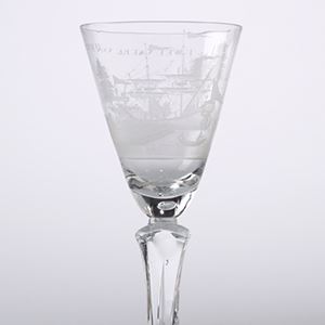 In deze ruimte zien we enkele prachtige voorbeelden van gegraveerde gelegenheidsglazen uit de 18e eeuw. Al deze glazen staan in verband met de scheepvaart. In de Republiek bestond destijds een uitgebreide traditie van drinkspelletjes en het uitbrengen van toasts; bij privé-gelegenheden zoals verlovingen en huwelijken, maar ook tijdens zakelijke en officiële bijeenkomsten zoals het uitvaren van een schip. Meestal is het de gastheer die de gelukwensen uitspreekt zoals ze in de glazen gegraveerd staan: op de gezondheid van de aanwezigen, de welvaart van de stad, of op een behouden vaart. Soms worden er wel tientallen verschillende toasts uitgebracht. Deze glazen tonen vooral afbeeldingen van schepen en de namen van hun kapiteins. Voor de gravures werden twee technieken gebruikt: de diamantgravure en de radgravure. Bij de diamantgravure wordt de afbeelding met een diamantstift in het oppervlak gekrast, met behulp van lijntjes en arceringen. Bij radgravures worden met een roterend radertje –bedekt met diamantgruis – dunne laagjes van het glas weggeslepen. Hierdoor ontstaat een prachtig spel van verschillende dieptes, en van matte en glanzende delen.