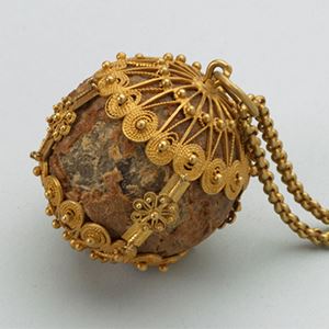 Flora and fauna from Asia, Africa and America made a huge impression on Europeans of the time. The world seemed to be richer and more varied than people had ever been able to imagine. Tropical woods, horn, mother-of-pearl, coral, tortoiseshell and ivory... collectors brought these natural materials together and attempted to categorise these amazing natural wonders. The materials were so precious that metalworkers often gave them silver or gold stands, doing their best to elevate the objects to an even higher artistic plane, and to outdo nature itself. For instance, here you can see a magnificent nautilus shell. The exterior of the shell has been very carefully sanded or etched away, revealing the underlying mother-of-pearl. And there is a coconut that has been made into an exclusive drinks bottle. But perhaps the most striking object is the bezoar stone, a small ball that looks somewhat like a nutmeg, in a decorative golden casing with a chain attached to it. Medicinal and mystical powers were ascribed to the stone, which is in fact not a rock at all but came from the stomach of a goat. It was thought to provide an effective antidote to arsenic, a deadly poison.