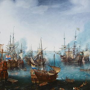 De zeeslag bij Gibraltar tussen de Nederlandse en de Spaanse vloot, 25 april 1607, Cornelis Claesz van Wieringen (circa 1575 - 1633), olieverf op doek, 1622. [A.0724] Tussen 1568 en 1648 voeren de Lage Landen tachtig jaar lang strijd om zich los te maken van het gezag van de Spaanse koning, koning Filips II. Dit schilderij van Cornelis van Wieringen verbeeldt een grote overwinning te water van de Nederlanders op de Spanjaarden, halverwege die 80-jarige oorlog voor onafhankelijkheid. In de baai van Gibraltar wordt de voor anker liggende Spaanse vloot compleet verrast door een Nederlandse aanval. We zien hoe kanonskogels worden afgevuurd, rookpluimen de horizon vullen, schepen tot zinken worden gebracht en drenkelingen voor hun leven vechten. Rechts op het doek is de rots van Gibraltar te zien. De Spaanse vloot wordt verslagen en de zeeslag leidt tot vredesonderhandelingen met Spanje en tot een twaalf jaar durende wapenstilstand. Het schilderij is gemaakt als cadeau voor prins Maurits van Oranje, de leider van de Nederlandse opstand tegen Spanje. Het moest herinneren aan het belang van onderlinge samenwerking tussen de Zeven Provinciën. In de Zeeslag bij Gibraltar trokken de admiraliteiten van de Republiek voor het eerst samen ten strijde tegen hun gezamenlijke vijand; en met succes!