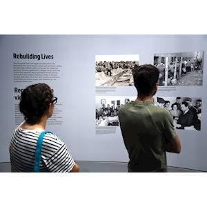 NARRATOR Following Germany’s surrender and the liberation of the camps, survivors of the catastrophe—former prisoners, refugees, people who had been in hiding—emerged, struggled to heal, and sought any means to rebuild their lives. In some instances, survivors tried to return to their homes to discover them in ruins… or worse. Some were met with hatred, more anti-Semitism, and even violence. Walter Kase: "We stayed in Poland for six months. It was a terrible time in Poland. After all of this suffering, the Jewish people went through concentration camps and ghettos and extermination camps in Poland, there was a wave of anti-Semitism in Poland. There were pogroms in small towns…” NARRATOR In many cases, individual survivors greeted their freedom alone—perhaps as the sole survivor of their family or community—and homeless. They were identified as displaced persons. Allied authorities and the United Nations Relief and Rehabilitation Administration made massive effort to shelter and support these people by creating Displaced Persons Camps in 1945. The conditions and processes at these camps were challenging at first. More than one million displaced persons—each with unique trauma and needs, lived in the camps. Often located in areas devastated by the war, the camps offered community building, job training, and education. Mady Deutsch: "…It was four years of my life, you know, just sitting and waiting in a camp, and I tried to learn whatever I could. If they offered a course in English, I started to learn English. If they offered a course in sewing, I tried to do that, to learn anything and everything or just keep occupied because I was just a young girl..." NARRATOR In the displaced persons camp, countless reunions, weddings, births, and religious celebrations took place. By 1952, approximately a quarter million Jews had moved through the camps to new lives—often in Israel, Canada, Latin America… and 72,000 Holocaust survivors emigrated to the United States. Nearly a thousand settled in Houston. But not everyone could be resilient. We hear testimony from many courageous survivors who faced extreme deprivation and trauma, who came through the catastrophe—sometimes scarred deeply. Just as powerful is the silence of those who did not make it. Many nameless. Many leaving no family to remember them. We honor their memory too.