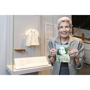 NARRATOR Of the six million Jews murdered by the Nazis, 1.5 million were children. Even as they entered the gas chambers, many Jewish mothers and fathers would—in their final gesture—embrace their children and utter words of comfort and love. Another kind of courage was exhibited by Jewish parents who sought whatever means were available to shield their children from deportation. Survivor Lea Krell Weems: “How brave they were and how unselfish. They gave my sister and me to this strange underground agency because they promised they would take care of us.” NARRATOR As the threat of deportation loomed, some parents handed their children to others to hide. The people who took the children did so at great risk to themselves. Discovery of hidden children would be a guaranteed ticket to the camps. The hidden children were sometimes kept in concealed places—out of sight. Others would be hidden in plain sight—at orphanages or disguised as members of Christian families. Some children—like survivor Morris I. Penn—were forced to fend for themselves after their families was deported or murdered. Morris I. Penn: “I can tell you when I used to stay in hiding by myself. You can run crazy, a whole day. Or in the barn was a little better because I used to walk around and around until I used to get dizzy. But many times I felt, I wish, I wish I could cry a little. We couldn’t cry. There were no tears, and many times, of course, I wished I wouldn’t wake up; but then there were times I thought maybe I’m the only one in hiding, and the Jewish people, the world won’t know what they did to us, so I got to keep on. I got to go on.” NARRATOR The tiny dress belonged to survivor Chaja Verveer, who—taken from her parents at the age of one—cycled through hiding, name changes, camp orphanages, and liberation. She was reunited with her mother and brothers later, but trauma haunted them all: “In the fairy tales everybody gets together and we live happily ever after and everybody loves each other and it’s the closest of families and the warmest of relationships. Unfortunately, in reality you have to consider that everybody was traumatized. When we came together, we all needed attention, every single one of us . . . and there was only that much attention that can go around.”