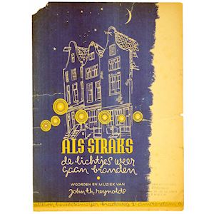 'Als op het Leidscheplein de lichtjes weer eens branden gaan' behoort tot de weinige bevrijdingsnummers die tegenwoordig nog altijd bij een groot publiek bekend zijn, maar de meeste liederen uit de korte periode van de bevrijding zijn ‘vergeten’. Een van de redenen hiervoor is dat deze liedjes niet op plaat zijn opgenomen, vanwege het gebrek aan materiaal en financiële middelen. Maar het grootste deel van de bevrijdingsmuziek was speciaal bedoeld om de vreugde en dankbaarheid te vieren. Toen het euforische moment van vrijheid geleidelijk had plaatsgemaakt voor het besef wat de oorlog aan schade had veroorzaakt, verloren de meeste liedjes hun functie. Wel worden de liedjes uitgegeven als bladmuziek, zodat de klanken van de bevrijding tot op de dag van vandaag nog altijd ten gehore gebracht kunnen worden. 𝘈𝘧𝘣𝘦𝘦𝘭𝘥𝘪𝘯𝘨: Als straks de lichtjes weer gaan branden, 1945. Collectie Streekmuseum Jan Anderson.