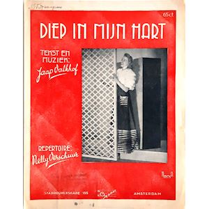 Een van de grootste hits tijdens de Tweede Wereldoorlog in Nederland is het liefdeslied 'Diep in mijn hart' van Jaap Valkhoff. In 1942 voert Nelly Verschuur dit nummer uit onder begeleiding van de band van Dick Willebrandts. De laatstgenoemde orkestleider kan in oorlogstijd op hoog niveau swingmuziek blijven spelen, omdat zijn big band verplicht optreedt voor de Deutsche Europa Sender (DES). Deze propagandazender verzorgt uitzendingen met swingmuziek vergezeld van propagandateksten voor de Engelse luisteraar, als concurrent van de BBC. De radio-opnames van het orkest van Willebrandts worden hiervoor veelvuldig gebruikt door de Duitse bezetter. 𝘈𝘧𝘣𝘦𝘦𝘭𝘥𝘪𝘯𝘨: Diep in mijn hart, 1943. Collectie Streekmuseum Jan Anderson.
