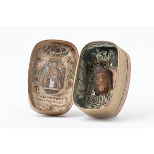 Kijk ook even naar het zelf geknutselde doosje verderop. Het is afkomstig van de Gasthuiszusters-Augustinessen van Antwerpen. In het doosje zit niet alleen een prent van de Ecce Homo, maar ook een wassen Vera Icon. Het geheel is versierd met textiel, pareltjes en pailletten. De Vera Icon verwijst naar de legende van de Heilige Veronica, ontstaan in de 13de eeuw. Tijdens Zijn kruistocht naar Golgotha komt Jezus Veronica tegen, op weg naar de markt om haar zakdoek te verkopen. Veronica wordt overmand door verdriet en medelijden en reikt Jezus haar zakdoek aan. Zijn zweet en bloed laten een wonderbaarlijke afdruk in de zakdoek na. De legende is ontzettend populair en past in de fascinatie voor het lijden van Jezus. De zweetdoek wordt de Vera Icon, ofwel het ware gelaat, niet door mensenhanden gemaakt. Het is dan ook een krachtige getuigenis van Christus’ menselijke gedaante. De Vera Icon krijgt als motief ook een plaats binnen de Arma Christi en is vooral in vrouwelijke kringen populair. Veronica is niet alleen de vrouw die het dichtst bij Jezus komt in Zijn lijden, ze is ook een krachtig element in de mystieke eenwording met Christus. De oorspronkelijke Vera Icon zou zich in Rome bevinden.