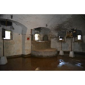 07a. Lokaal 86 : Caponnière. De Caponnière is een uitbouw in de droge gracht om de eventuele aanvallers in de gracht, vanaf de flank onder vuur te nemen. Let ook op de mooie knik , die speciaal is ontworpen om eigen kruisvuur mogelijk te maken en niet op de eigen stelling aan de overzijde te schieten. Zie ook de plattegrond en kijk door de schietgaten naar de droge gracht en Escarp ofwel fort-muur. Maar ook naar de tegenoverliggende Contrescarp muur.