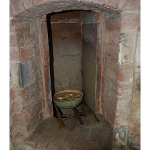 Druipkokers dienden ter opvang van regenwater, dat op het kleidak van het fort neerkwam en gefilterd via kokers naar beneden komt. Het kon als drinkwater worden gebruikt. U ziet hier, drie druipkokers. En in de vloer een Welput met grondwater. Ga de deur rechts, binnen : Lokaal 32.