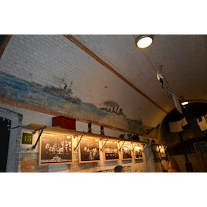 Lokaal 15 : Marine Lokaal, Tweede Wereldoorlog. Zie hoe mooi deze Wandschildering is van Matroos Pieter Hazenberg uit Noord Holland. Wonend aan zee, diende hij hier met zijn kornuiten, samen twintig marine knapen. In een molshoop nabij de Duitse Grens. Ver van de woelige zee met zijn trotse Marineschepen en indrukwekkend Scheepsgeschut. Heimwee had hun ziel bevangen, vanaf de Mobilisatie einde 1939, verlangend naar huis , de zee en het meisje ; zoals Toos verlangt naar haar vrijer. Zij schreven het zelf op de wanden en schilderden deze prachtige tekening met echt werkende vuurtoren, waarschuwend voor gevaar ; waarlijk fenomenaal. U denkt ! Waarom zaten zij hier? “Het antwoord, in een kort verhaal“ : En het gaat als volgt : Na de eerste Wereldoorlog, heerste de opvatting in Nederland van de gebroken geweertjes ; Namelijk : Als je geen wapens bezit krijg je ook geen oorlog. Bij Koninklijk besluit wordt Fort Pannerden in 1926 daarom gedegradeerd tot Vestingwerk van Géén Klasse. Het fort word ontmanteld. De grote kanonnen blijven wel staan maar verouderen in techniek en de munitie ervoor verdwijnt. Dan valt Hitler-Duitsland, Polen binnen in 1939 en denkt de regering in Den Haag : we moeten onze landsgrens gaan verdedigen. Fort Pannerden is daarbij van groot belang door zijn strategische positie bij de splitsing van Rijn en Waal. De waterwegen moeten beheerst worden : scheepvaartverkeer bewaakt, vijandelijk vervoer van oorlogsgoederen of materieel voorkomen én natuurlijk de zo belangrijke watertoevoer voor ’s-Lands Waterverdeling. Belangrijk voor de waterstand in de landbouw, economisch scheepsverkeer , drinkwater, én hét verdedigingsmiddel voor de Nieuwe Hollandse Waterlinie. Honderdvijf soldaten Infanterie bemanden het fort, en twintig matrozen die de scheepskanonnen uit Den Helder bedienden. Nieuwe kanonnen of munitie in Duitsland bestellen, zoals voorheen, kon nu natuurlijk niet. Vandaar deze improvisatie maatregel. Er moesten Marine Kanons geplaatst worden i.p.v. Landmacht kanonnen. Ga naar het activeer bordje bij de scheepsfoto.
