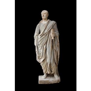 Cet homme revêtu de sa toge est un citoyen romain. Tous les citoyens hommes pouvaient et devaient en effet porter la toge lors des cérémonies officielles : au tribunal, lors des cérémonies religieuses, des dîners en l'honneur de l'empereur, etc... En plus d'être un symbole de prestige, la toge était une marque de l'identité romaine. Le poète Virgile appelait d'ailleurs les Romains « Le peuple à la toge ». Pour les femmes mariées, il y avait quelque chose de similaire : en tant que citoyennes, elles portaient lors des évènements officiels une stola, une robe jusqu'aux chevilles. Le rouleau de papyrus que tient cet homme est également un indice. Il semble qu'il va prononcer un discours. A Rome, celui qui maîtrisait l'art d'écrire et de parler avait accès au pouvoir. Sous sa toge, l'homme porte une tunique en laine, vêtement taillé dans un simple rectangle de tissu. Aux pieds, il porte des calcei, ces chaussures fermées, hautes et souples, qui faisaient également partie de l'habillement officiel des citoyens. Les toges n'étaient absolument pas pratiques. Le tissu d'une toge faisait environ cinq mètres de long sur deux mètres et demi de large, et il fallait au moins deux personnes pour pouvoir bien la draper. Quand un homme revêtu de sa toge rentrait chez lui, il reprenait vite son pallium, un manteau plus simple. Et pour terminer : comment cette statue plus grande que nature a-t-elle pu être réalisée ? Le corps était en majeure partie un travail en série. Ces corps, faits de matériaux différents, de tailles différentes et de types différents, étaient entreposés dans l'atelier du sculpteur : avec toge, nus, en uniformes militaires, etc... Le client choisissait le type qui lui convenait et qui correspondait à la raison de commander la statue. Ensuite il faisait sculpter la tête séparément, comme un portrait. N'oublions pas que les statues romaines étaient toujours peintes.