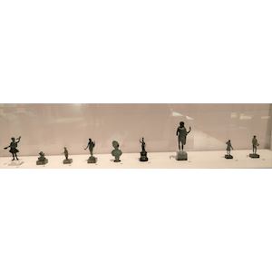 Voor de Romeinen waren de goden erg belangrijk. Beeldjes van goden, zoals deze, stonden samen op een speciaal plekje in hun huizen. De bewoners offerden vaak aan de goden: op vaste feestdagen in het jaar, en ook op belangrijke momenten in het leven: een geboorte, een huwelijk, een overlijden… Zie je helemaal links het beeldje van de god die een drinkhoorn in de lucht houdt? Dat is een Lar. Laren beschermden het huis en het gezin. Aan deze Laren offerden meisjes hun speelgoed en kleren als ze gingen trouwen. Dat kon al als ze 12 waren. Jongens deden hetzelfde wanneer ze een ‘man’ werden, rond hun 16de. Naast de Lar staan Cupido, een liefdesgodje, en Ceres, de godin van de landbouw. En naast haar Jupiter, ken je die? De baas van de goden? In zijn rechterhand houdt Jupiter de bliksem vast… Want Romeinen dachten dat hij de bliksem naar de aarde slingerde! Rechts van hem zie je zijn vrouw, Juno. Zij beschermde álle vrouwen. De godin naast haar is een dochter van Jupiter. Ze heet Minerva. Ze draagt een speer, een helm en een harnas. Minerva was de godin van de oorlog, maar ook van de wijsheid, de slimheid. Beeldjes van goden vinden archeologen overal in het Romeinse Rijk.