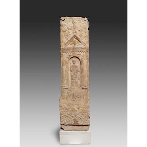 Cette stèle funéraire a été trouvée à Carthage, dans la province d'Afrique proconsulaire. Elle date du premier ou du deuxième siècle après Jésus-Christ. Carthage, qui faisait alors partie depuis quelques siècles de l'Empire romain, était une grande ville très prospère. C'est d'ailleurs assez étonnant, parce qu'au troisième et au deuxième siècle avant Jésus-Christ, le royaume de Carthage était encore l'ennemi juré de Rome. La ville avait même été détruite par les Romains. La pierre témoigne de ce qu'on retrouve dans beaucoup d'objets de l'Empire romain : un mélange de traditions locales et d'éléments de la culture romaine. Au milieu, on voit une femme debout, dans un bâtiment qui ressemble à un sanctuaire romain. Elle porte une tunique romaine avec un manteau par-dessus et tient dans sa main gauche une offrande. Sous le sanctuaire, on voit un taureau, animal sacrificiel dans de nombreuses religions, et également chez les Romains. Au-dessus du toit du temple, une représentation frontale de la déesse Tanit nue. Pour les Carthaginois, qui la vénéraient depuis des siècles, c'était la déesse principale. Tanit était la déesse de la fécondité : on le voit à ses deux cornes d'abondance ; de celle de gauche sortent un palmier et un grenadier, et de celle de droite un palmier et une grappe de raisin. À tout cela s'ajoutent un oiseau et un soleil couronné à gauche, un quadrupède rayé à droite, et tout en haut un croissant de lune. Dans la Carthage romaine, Tanit était aussi vénérée sous ses noms latins, et donc romains. L'un de ces noms était Junon Caelestis, 'la Junon céleste'. Et Junon était la femme de Jupiter, le maître des dieux romains. Si tout ça n'est pas un mélange de cultures...