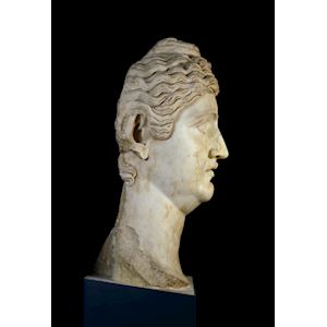 Deze kolossale marmeren kop hoorde bij een standbeeld van zowat vier meter hoog. Je staat oog in oog met Faustina, de populaire echtgenote van keizer Antoninus Pius. Faustina’s reuzenbeeld is gemaakt rond 140 na Christus en werd toen, net als dat van haar man, opgesteld in de tempel voor de godin Artemis in de stad Sardis. Die lag in de provincie Asia, nu het westen van Turkije. Tijdens de regering van Antoninus Pius verkreeg Sardis van de Romeinse senaat, en met toestemming van de keizer, het privilege om zich te profileren als provinciaal centrum voor de keizercultus. In het oosten van het Romeinse Rijk, en in het bijzonder in Klein-Azië, speelde de verering van de levende keizer een erg belangrijke rol. De officiële erkenning vanuit Rome gaf een stad onder meer het recht een tempel voor de keizercultus te bouwen. In Sardis maakte men uitzonderlijk gebruik van een bestaande tempel. De erkenning bezorgde Sardis in de eerste plaats prestige. Maar daarnaast gaf het ook een enorme impuls aan de ontwikkeling van de stad, niet het minst door de organisatie van druk bijgewoonde en dus ook lucratieve festivals. Vermoedelijk wilde de bevolking van Sardis de keizer en keizerin met de beelden bedanken voor de eer die hun te beurt was gevallen. Het beeld van Faustina was een zogenaamde akroliet, een beeld uit diverse materialen waarvan enkel de zichtbare lichaamsdelen in marmer waren uitgewerkt, zoals het hoofd, de handen en de voeten. ‘Akros’ betekent ‘uiterst’ in het Grieks, en ‘lithos’ ‘steen’. De torso van een akroliet was van hout. Dat hout werd bedekt met echte of metalen kledij, of het werd verguld.