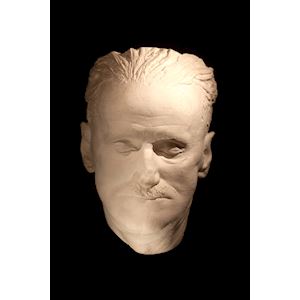 This death mask is a copy of one cast from Joyce’s face on the day he died. When Joyce and his family moved to Zurich in December 1940 they were assisted by Carola Giedion-Welcker and others. Shortly after his arrival, Joyce complained of stomach cramps and was operated on for a perforated ulcer. He died of peritonitis two days later on 13 January 1941. Carola Giedion-Welcker arranged for the sculptor Paul Speck to make casts from Joyce’s face for a death mask. Giedion-Welcker ordered two casts, but it may be that more than two were made, and some copies of the originals were also made in the 1950s. One of the originals was given to Michael Scott who helped establish the Joyce Museum at the Martello Tower at Sandycove, and the mask is on view there today.