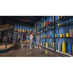 Bienvenue dans la salle de l’artillerie. L'obusier lourd de campagne allemand de 15 cm avec son chariot frontal attirera immédiatement votre attention. Ce poids lourd était capable de tirer jusqu’à une distance de près de 8 kilomètres. Examinez aussi la collection de munitions colorées. Ces différentes couleurs aidaient à l’identification rapide des obus. L’artillerie a joué un rôle essentiel lors de la Bataille de Passchendaele. Les énormes bombardements préparatoires n’ont pas réussi à détruire toutes les positions allemandes. Ces tirs d’obus ont par contre détruit le paysage, y compris les systèmes de drainage. Lorsqu’il pleuvait, ce qui arrive relativement souvent en Flandre, l’eau n’arrivait pas à s’écouler correctement vers les zones en contrebas. Cela gênait la progression des canons, provoquant la défection du soutien de l’artillerie et l’échec des attaques. Des millions d’obus ont été tirés au cours de la bataille. Plus d’une munition sur cinq n’a pas explosé dans la boue des campagnes flamandes. Aujourd’hui encore, le service de déminage de l’armée belge collecte toujours des centaines de tonnes de munitions équipées d'une charge explosive par an. Jetez un œil au plafond avant de quitter la salle. Vous voyez cette grande peinture ? Cette œuvre d’art prêtée par l’Australian War Memorial. Elle dépeint comment des troupes australiennes ont essayé de conquérir le bois du Polygone.